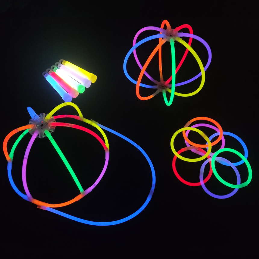 - 6 Pcs 4″ Glow Sticks: Estos diminutos palitos luminosos son ideales para añadir más brillo y textura a tus diseños. Con un diámetro más estrecho y una longitud de 4 pulgadas, son ideales para amplificar el impacto visual de sus diseños. Se ofrecen en los mismos seis colores.