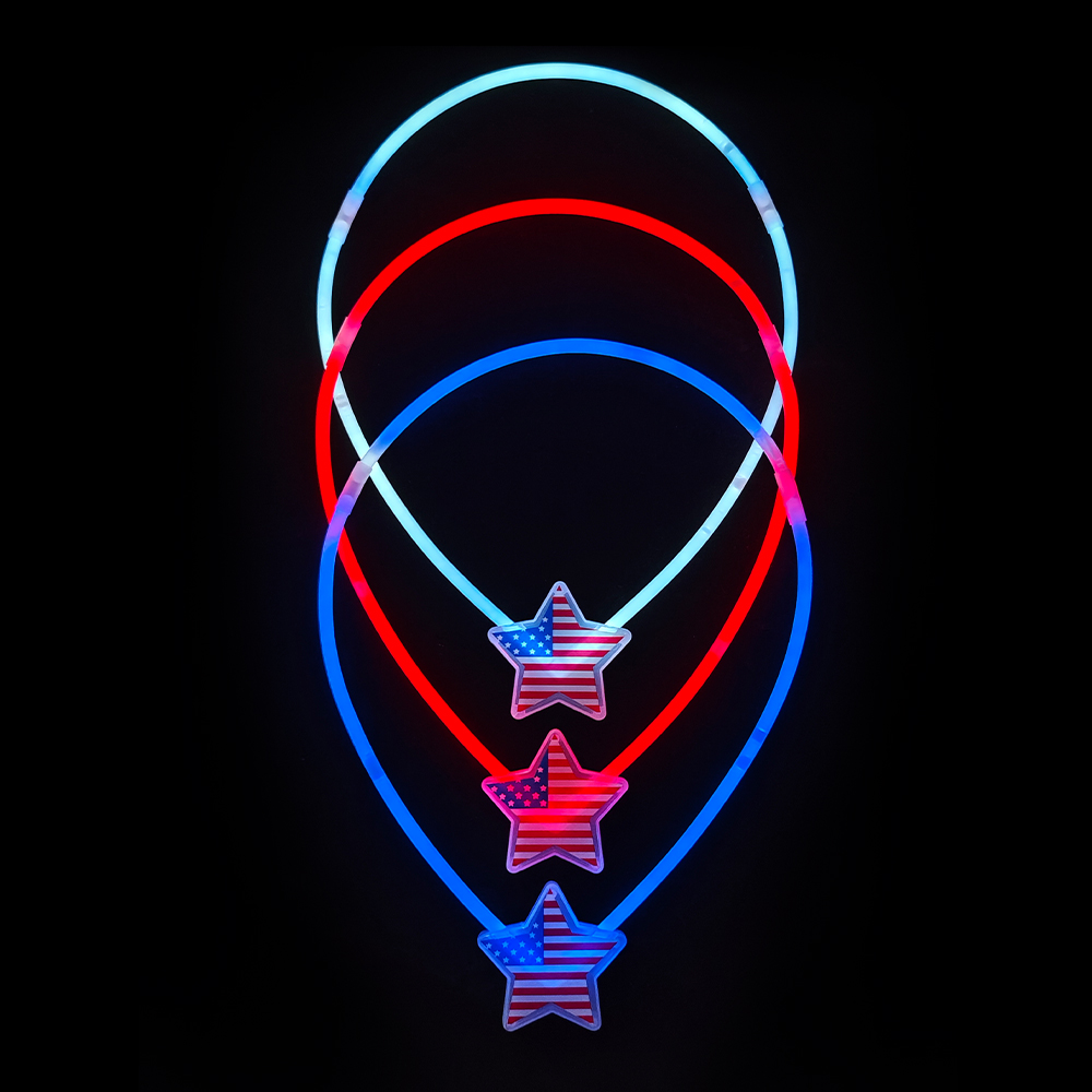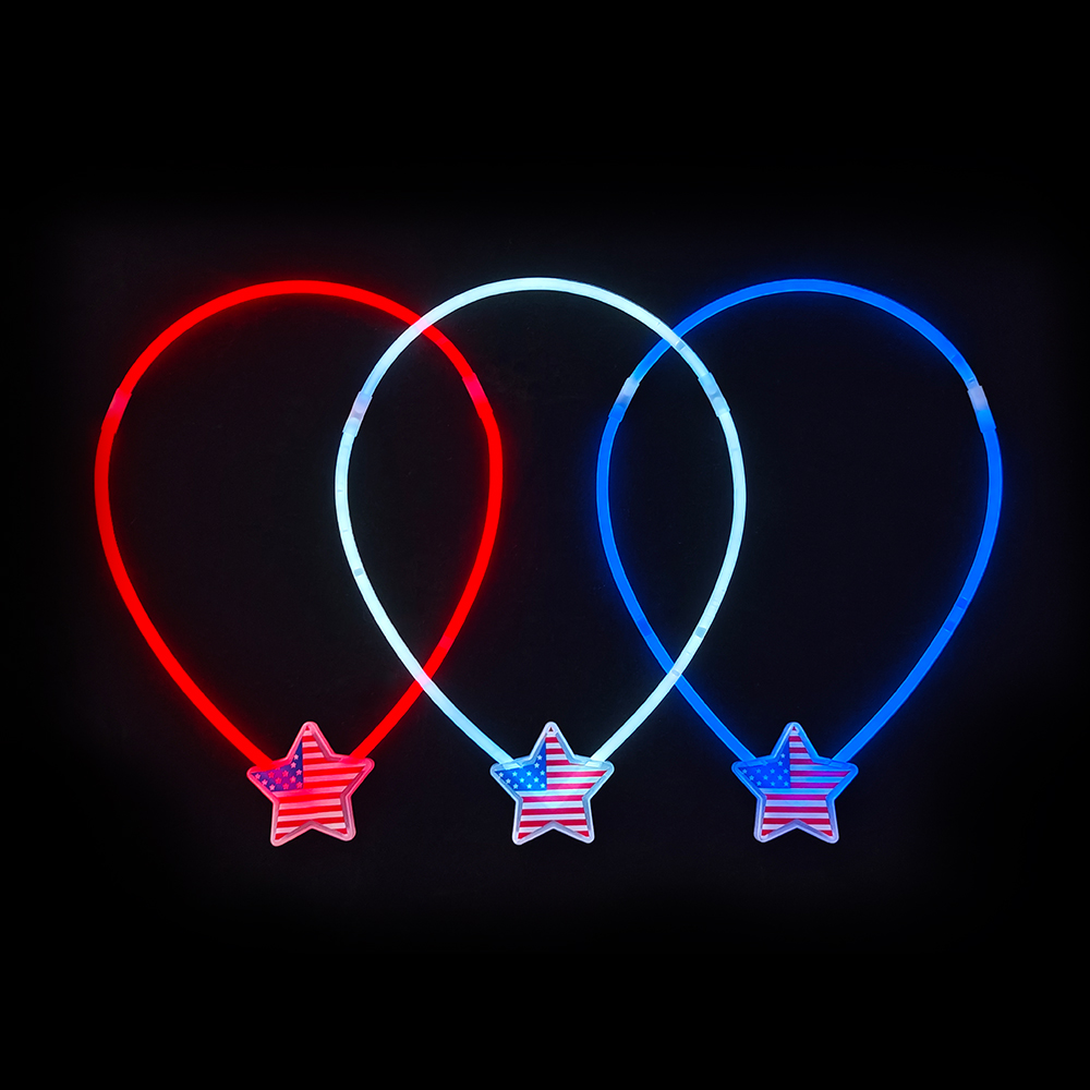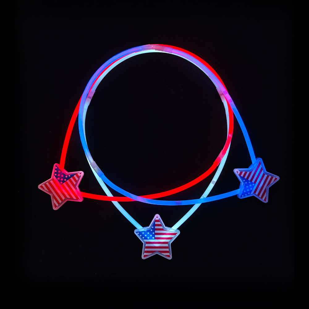 Это флуоресцентное ожерелье "Американский национальный день с пятиконечной звездой" имеет классические красные, белые и синие цвета американского флага, ловко сочетая форму пятиконечной звезды с флуоресцентным ошейником, излучающим яркий и привлекающий внимание свет в темном помещении. 4 июля, во время Дня независимости США, будь то оживленный уличный парад, ношение его перекликается с темой патриотизма и становится заметным присутствием в толпе; теплая семейная вечеринка во дворе, добавляя очки в праздничную атмосферу с флуоресцентными огнями; на общественных собраниях и патриотических мероприятиях, он может помочь владельцам быстро погрузиться в праздничную атмосферу, использовать ослепительный свет, чтобы передать энтузиазм к стране, и стать привлекающими внимание небольшими объектами для создания захватывающего опыта Национального дня.