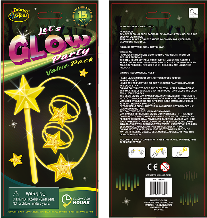 - The Glow Star Value Pack is designed to make you shine bright like a star by adding a heavenly ambiance to any event. These brilliant goods will brighten the mood and make treasured memories for any event—be it a birthday party, a lovely New Year’s Eve party, an exciting concert or funfair, a pleasant funfair, an incredible Halloween party or a cosy Christmas gathering. Their artistic potential also extends beyond personal usage; they may be used as fascinating light decorations, engaging gestural instruction aids, or in theatrical performances. They also make great gifts or attractive party favours that are sure to wow your loved ones.
